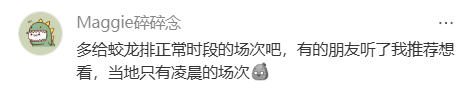 半点三点,这个点谁会特地跑去影院看片?看个舟师特种兵电影,我方得先作念到“特种兵式”的不雅影,由衷地但愿这些影城的司理们,约略看到不雅众的呼声,能给《蛟龙行动》排一些相对平时合理的场次啊。