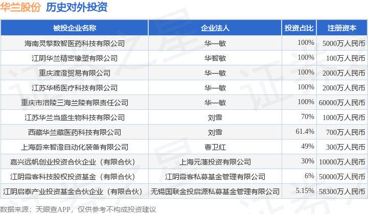本站音讯,凭据天眼查APP领路,华兰股份(301093.SZ)新增一谈对外投资事件,被投资公司为海南灵擎数智医药科技有限公司,法定代表东谈主华一敏,投资占比为100%。该公司从事络续和磨真金不怕火发展,注册成本为5000万东谈主民币。现在,华兰股份共存在对外投资11项,详见下表: