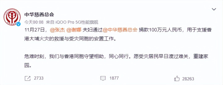 张杰谢娜佳耦于27日仍是为该事件的援救和安置责任捐钱100万元。