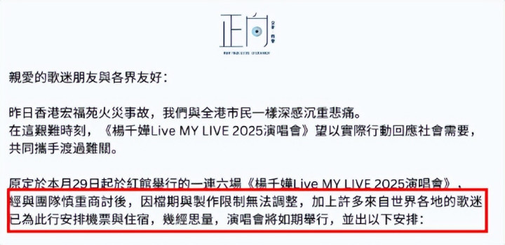 固然因为各种原因照实无法取消演唱会,但杨千嬅用我方独有的视角为这次事件出了一份力,也为她的粉丝作念出了一个正向的辅导。