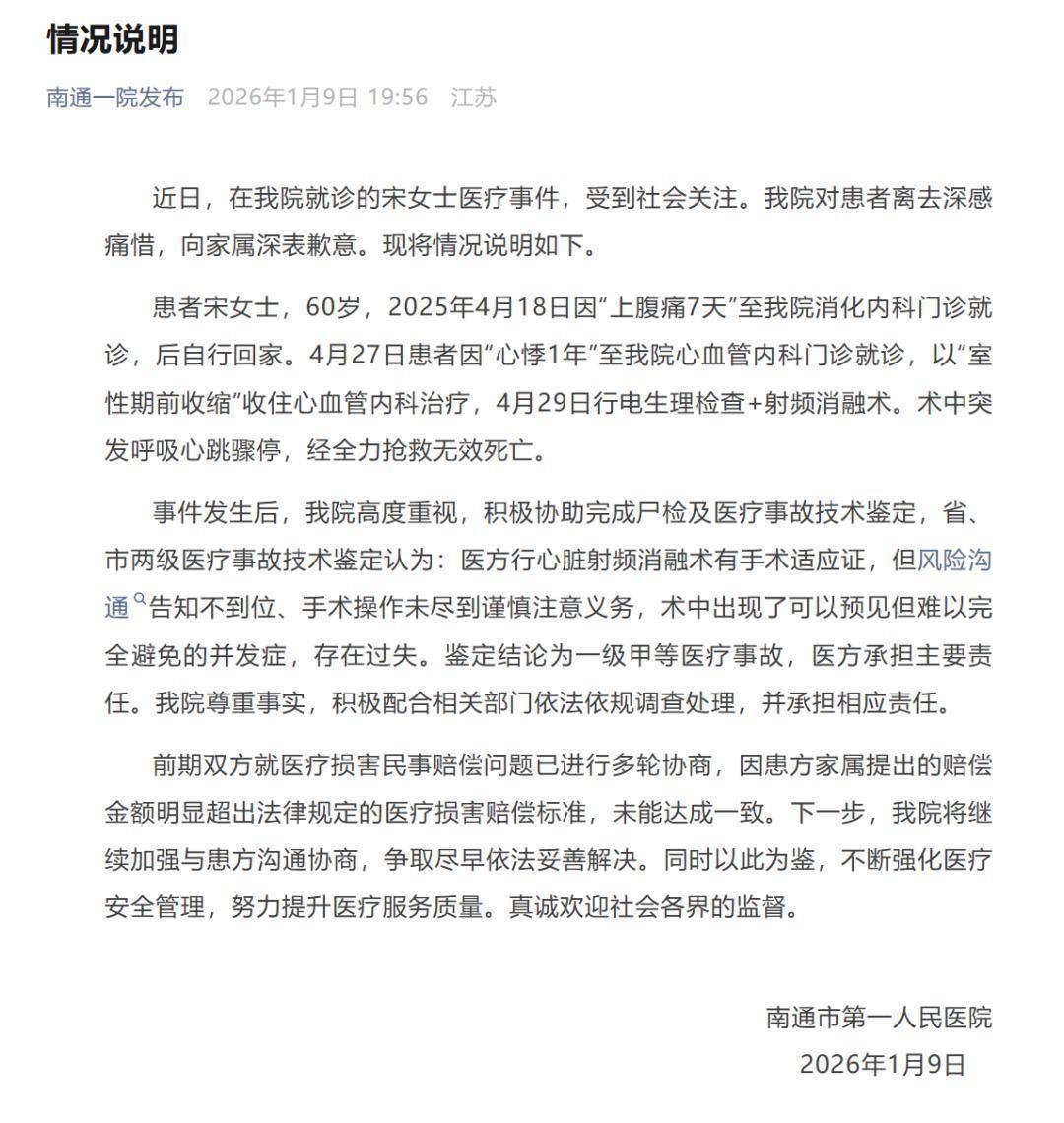 此前据上游新闻报说念,2025年4月,江苏省南通市的宋女士因胃病到南通市第一东说念主民病院就诊,本思着作念个胃镜查验,却被见知其患有心悸无法进行全麻。几天后,衔命医嘱的宋女士到心血管内科住院调解,并进行了“腹黑电生理查验及射频消融术”。上了手术台后,宋女士就再也没下来。