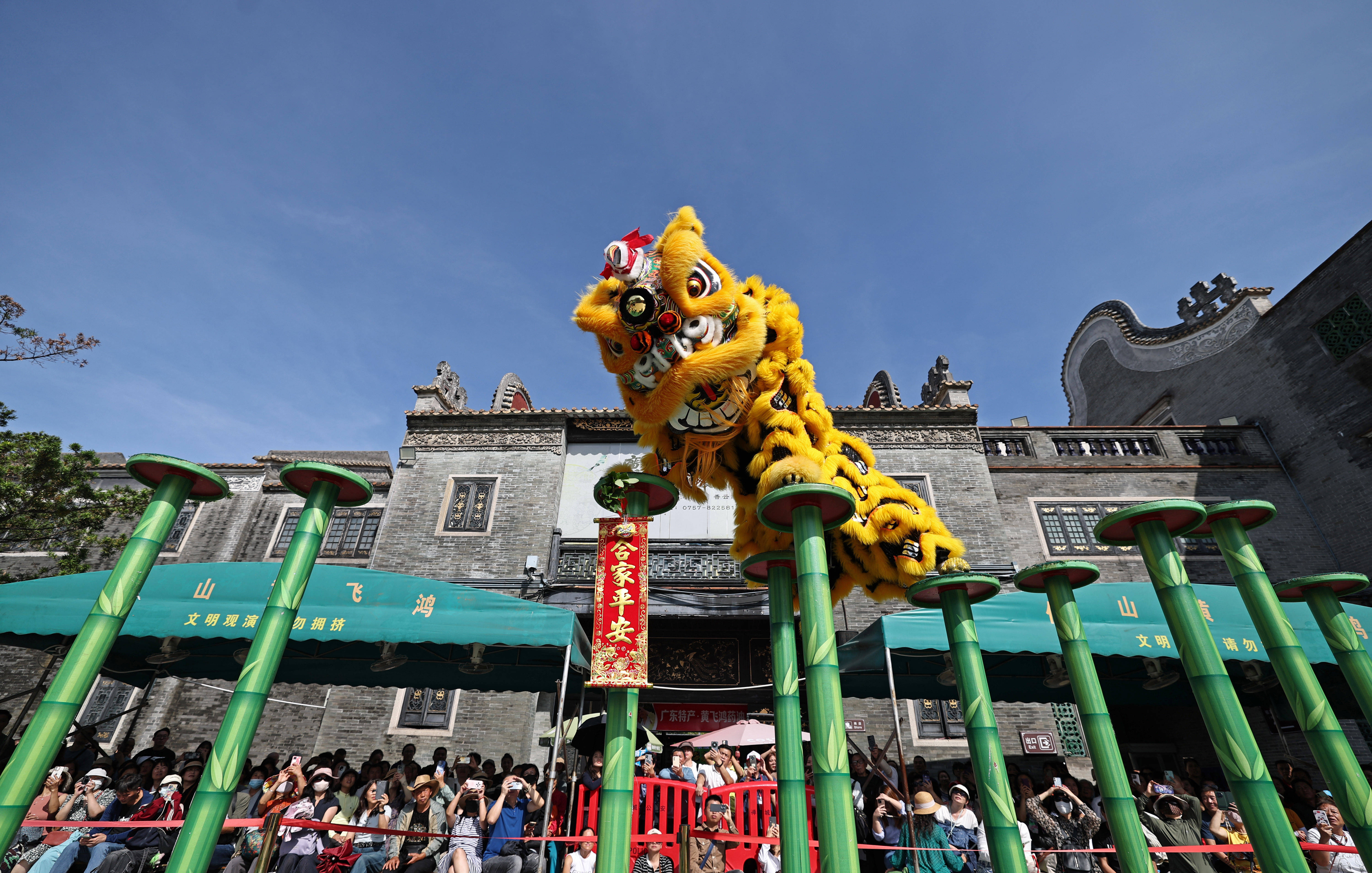 两端黄色醒狮担任起“迎宾员”。受访者供图佛山赛区