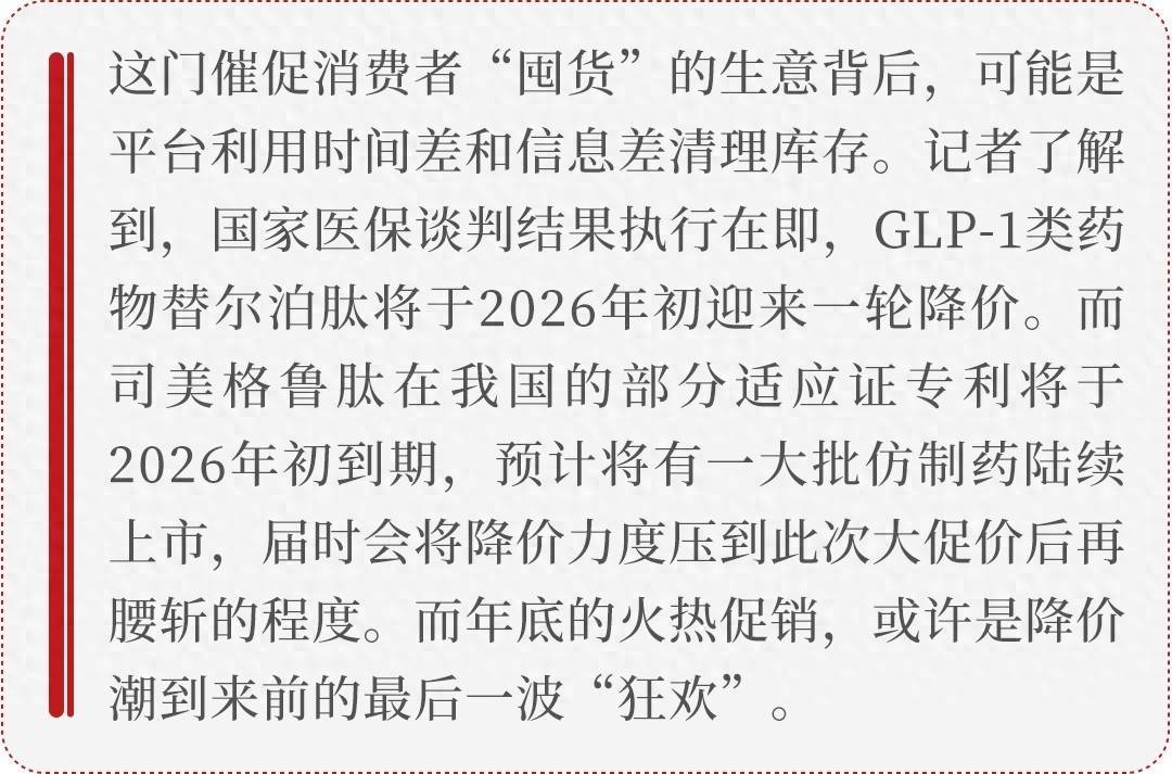 而这门催促奢靡者“囤货”的生意背后,可能是平台期骗时辰差和信息差计帐库存。东说念主民日报健康客户端记者了解到,国度医保谈判为止实行在即,GLP-1类药物替尔泊肽将于2026岁首迎来一轮降价。司好意思格鲁肽在我国的部分合适证专利也将于2026岁首到期,展望国内将有一大都仿制药不绝上市,届时可能会将降价力度压到这次大促价后再腰斩的进程。而年底的火热促销,省略是降价潮到来前的终末一波“狂欢”。